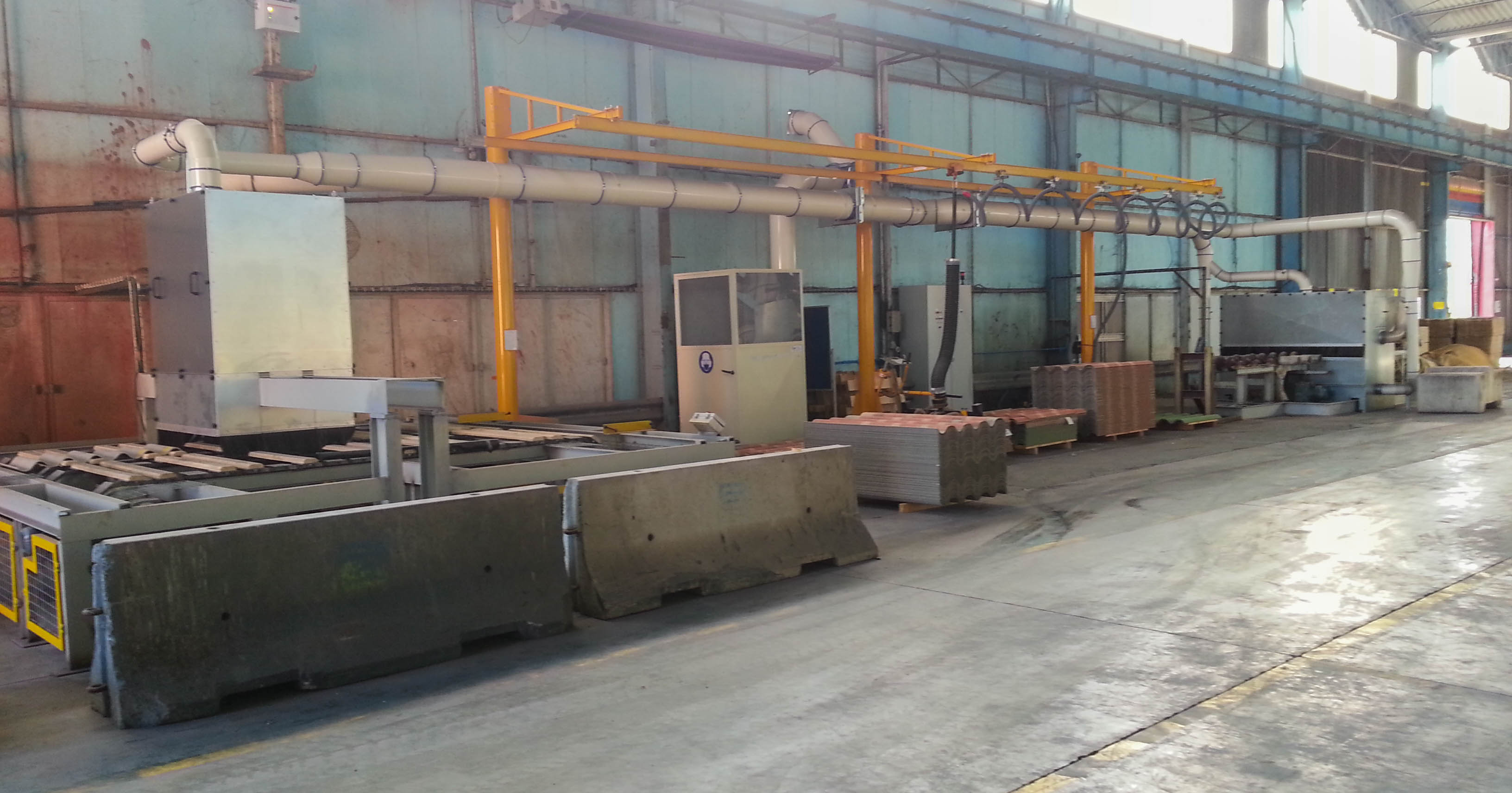 Aspiration de poussière avec réseau gaine laquées sur scie de découpe de plaque ondulée avec insonorisation des portes de travail.