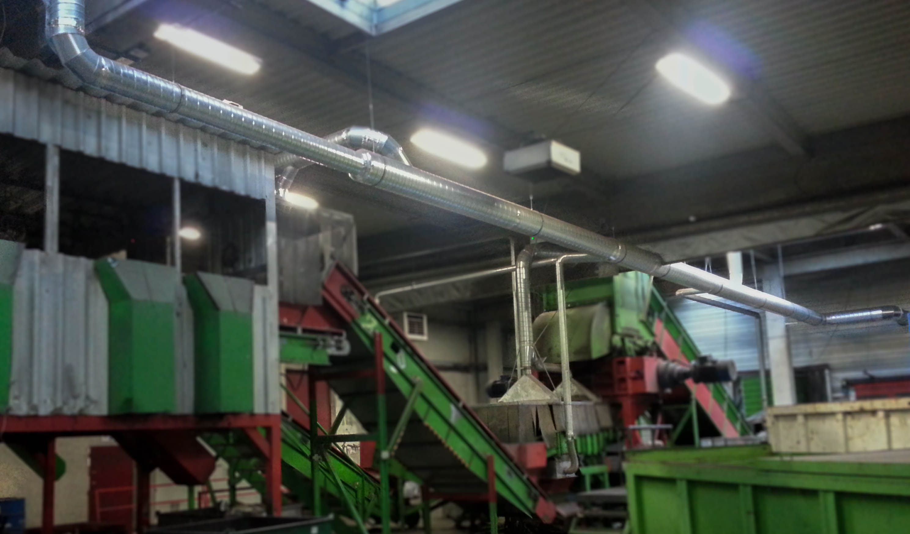 Dépoussiérage sur une ligne d’un centre de tri de déchets. Réseau en gaine spiralée et capotage en acier galvanisé.