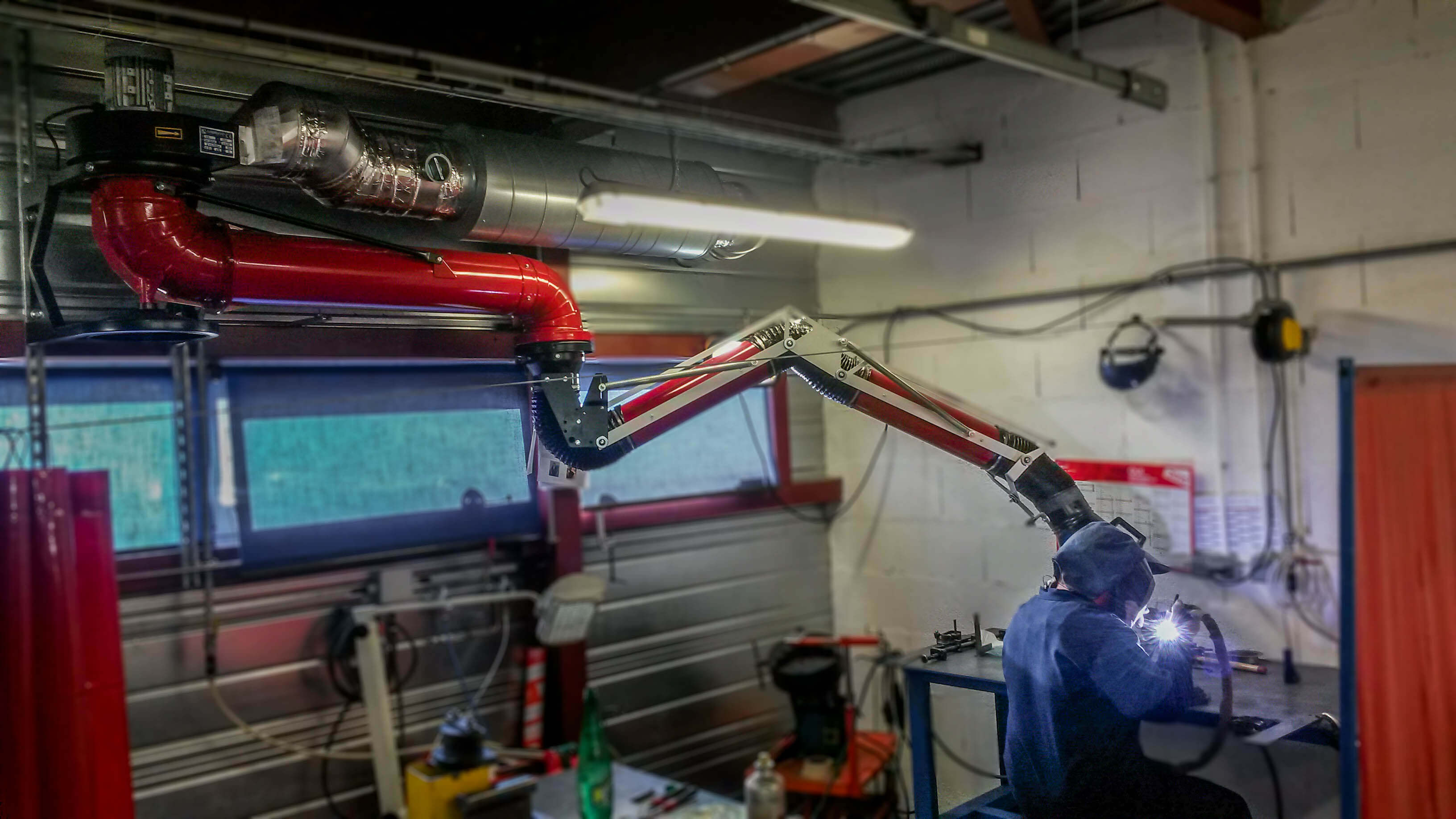 Bras articulé aspirant rouge avec rallonge pour aspiration de fumée de soudure installé dans un atelier pour sous-traitant aéronautique. Ventilateur [...]