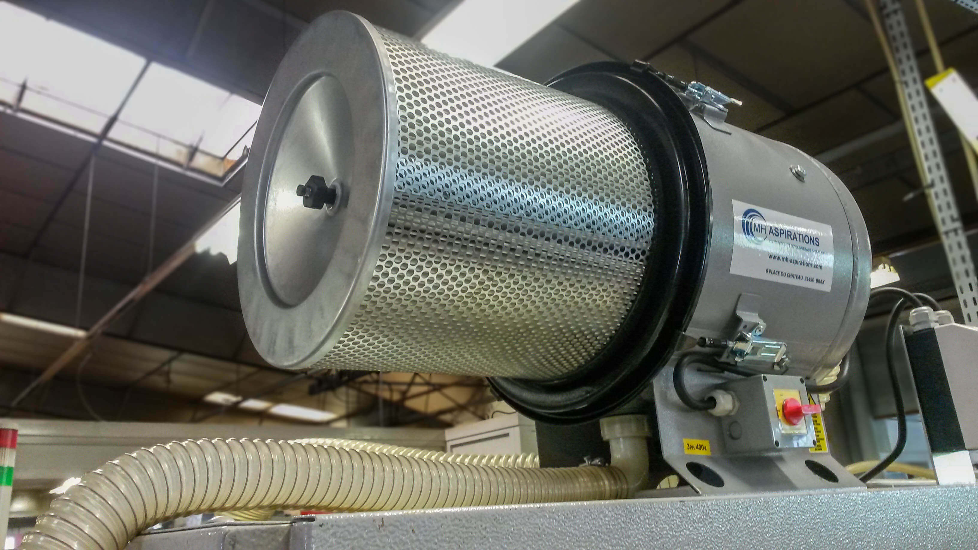Ventilateur installé sur une machine à commande numérique dans un atelier de sous-traitant aéronautique pour aspiration de brouillard d’huile.