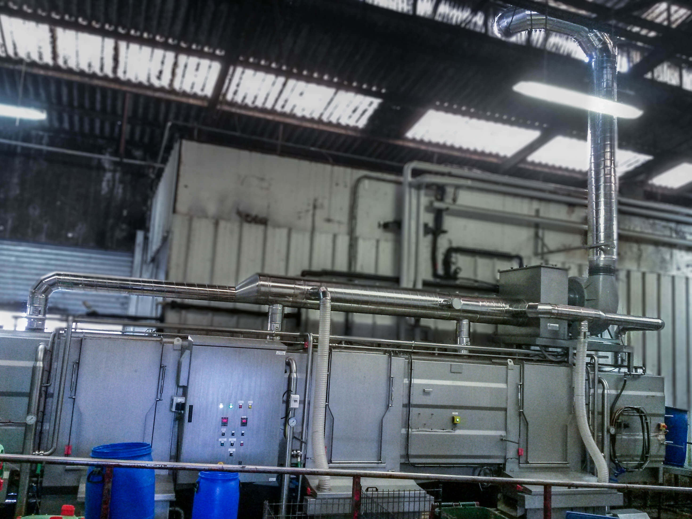 Réseau gaine galvanisée avec filtre trico-métallique et ventilateur plastique pour aspiration de buées sur un tunnel de lavage.