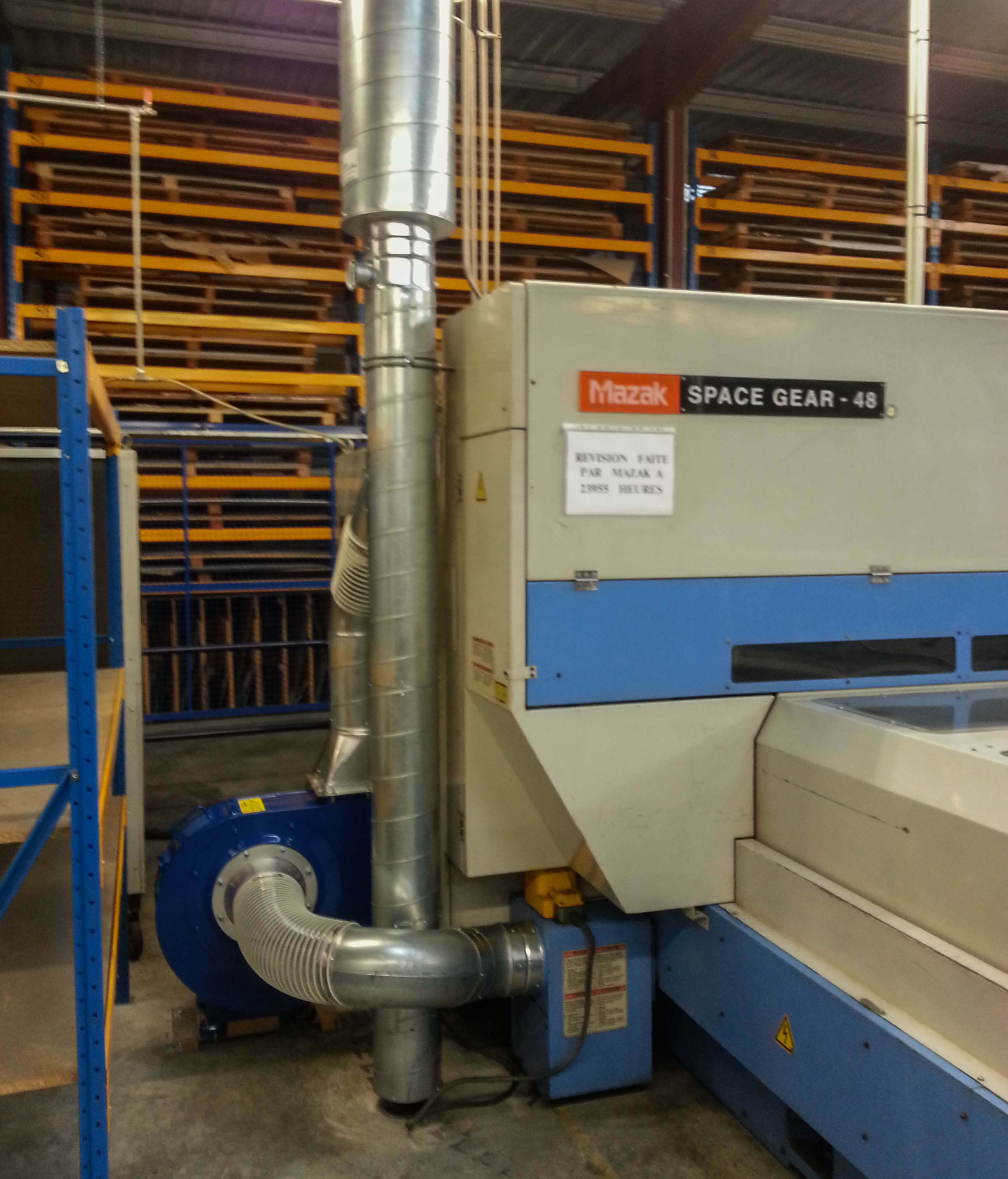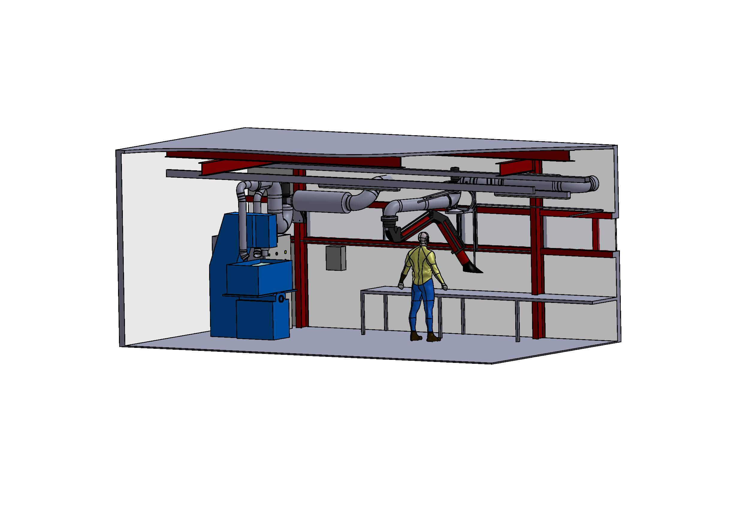 Aspiration fumée sur machine découpe laser avec un réseau en gaine spiralée galvanisée et un ventilateur bleu. Silencieux au refoulement. [...]