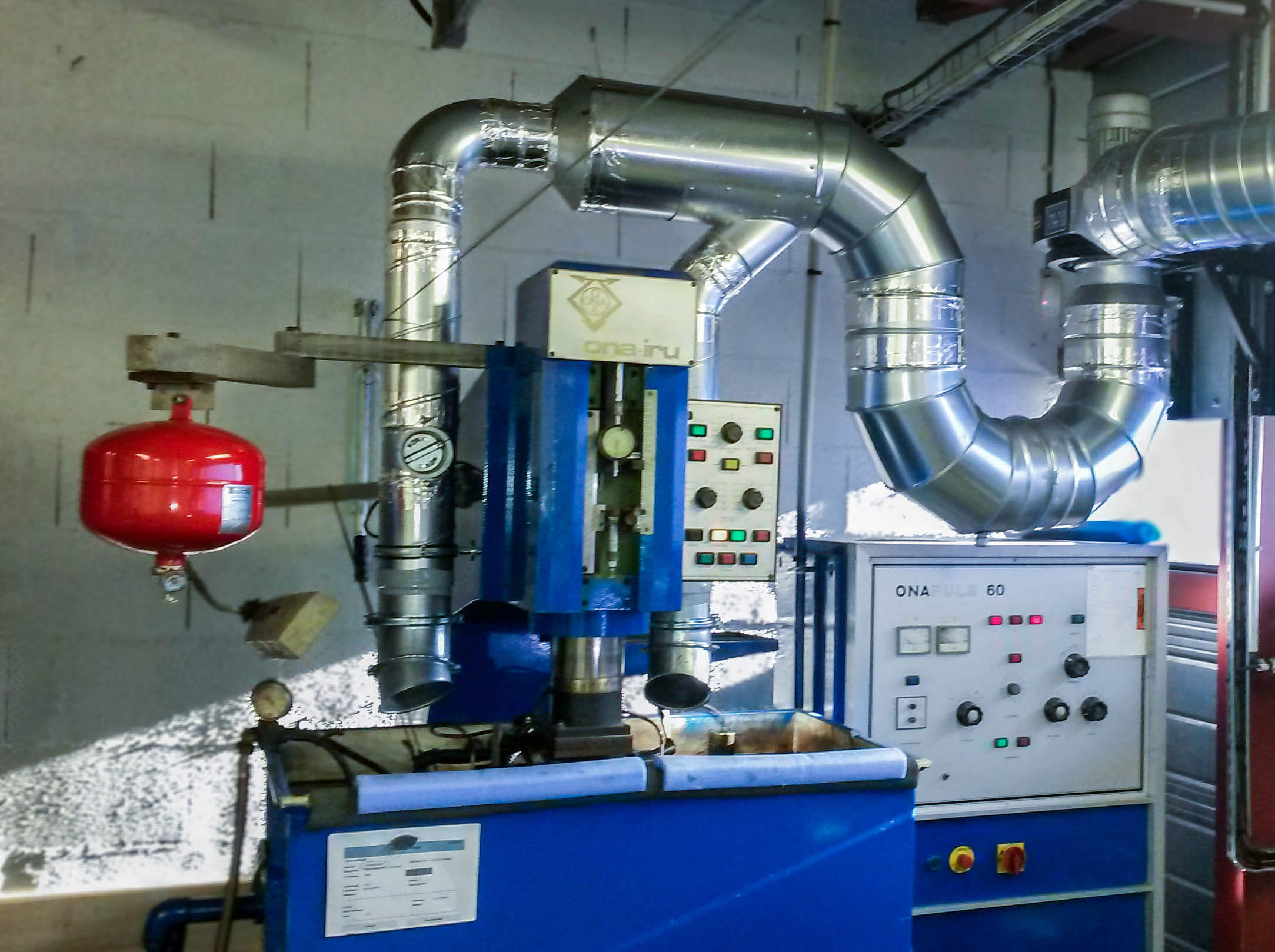Aspiration fumée sur machine découpe laser avec un réseau en gaine spiralée galvanisée et un ventilateur bleu. Silencieux au refoulement.