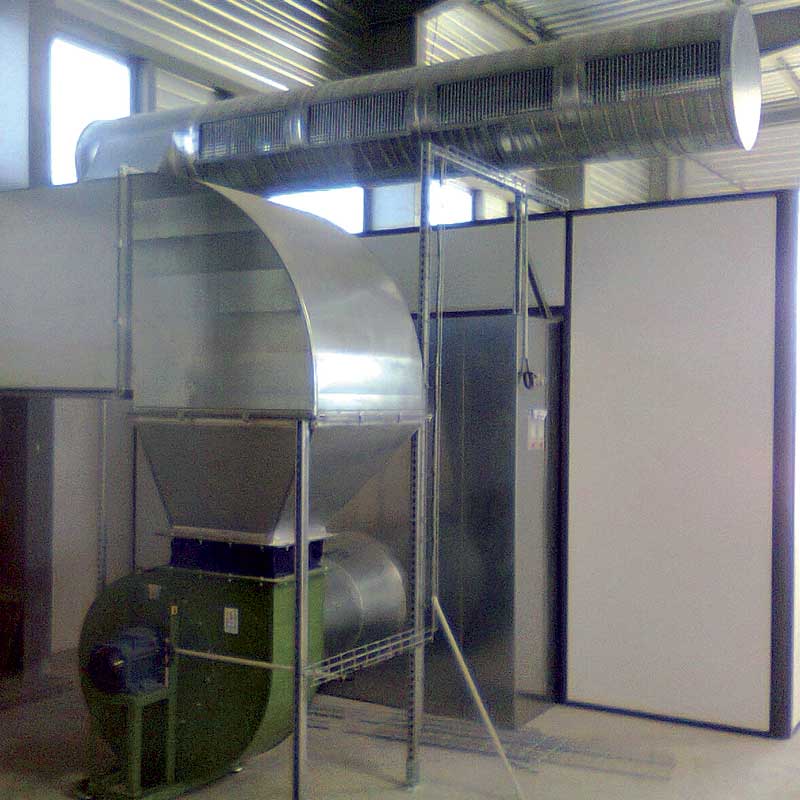 Aspiration de poussière avec réseau gaine laquées sur scie de découpe de plaque ondulée avec insonorisation des portes de travail.