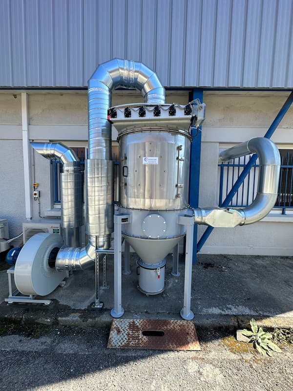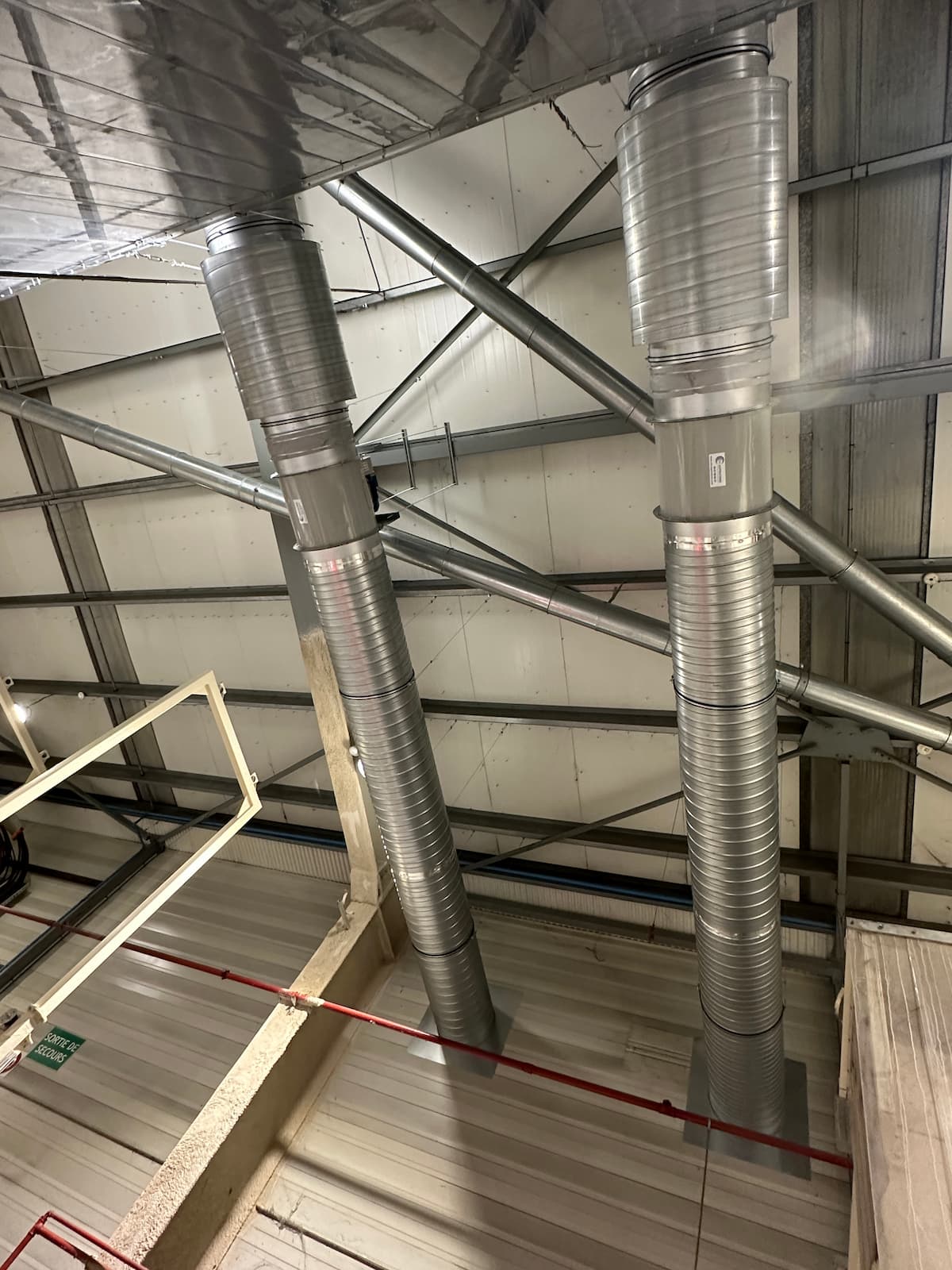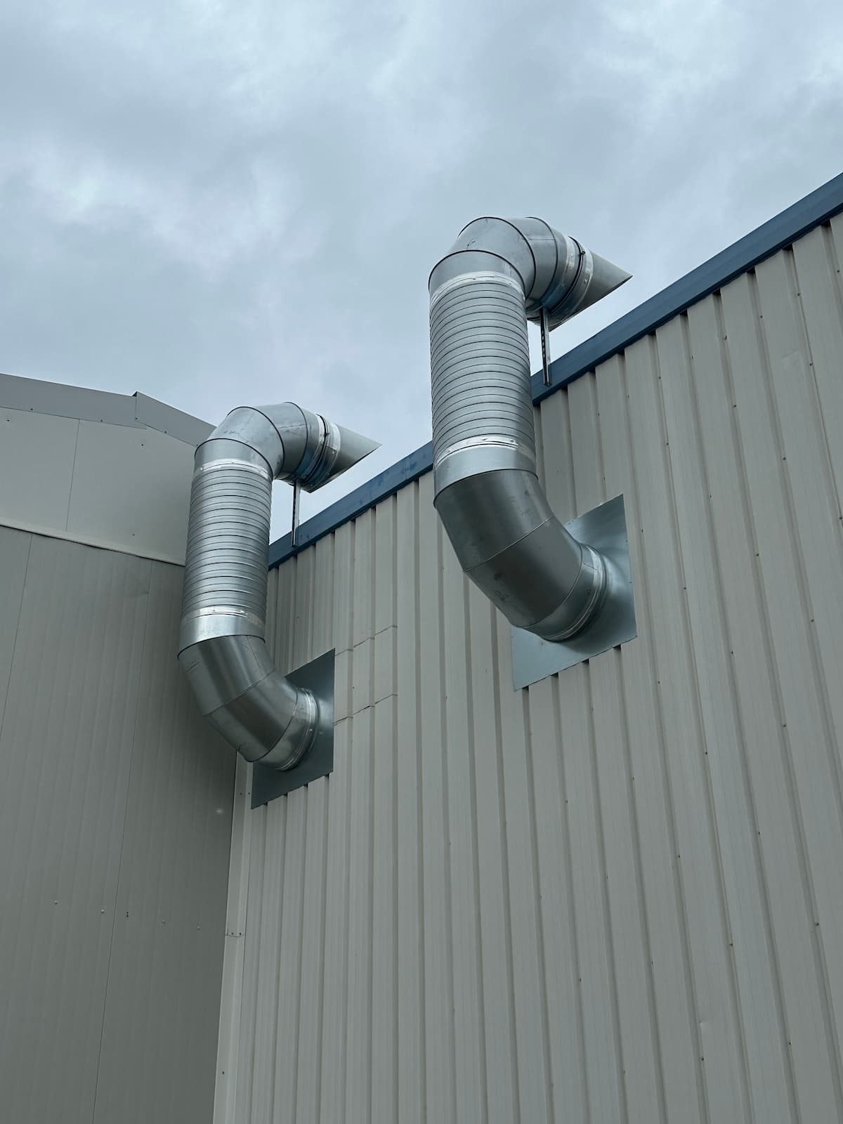Système d'extraction d'air installé sur la façade d'un entrepôt industriel, composé de conduits métalliques galvanisés formant un réseau vertical et [...]