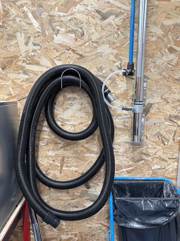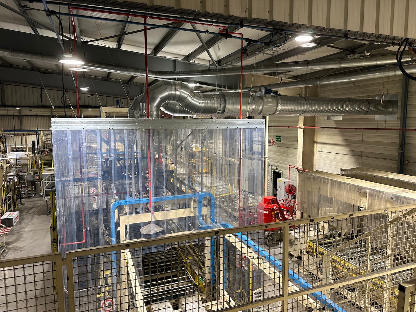 Hotte d'aspiration avec lanières souples translucides et conduits galvanisés installée par MH Aspirations sur machine de découpe d'isolants à Toulouse