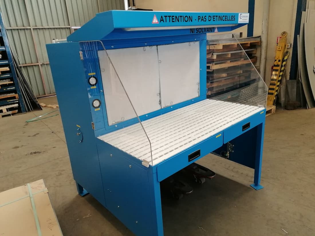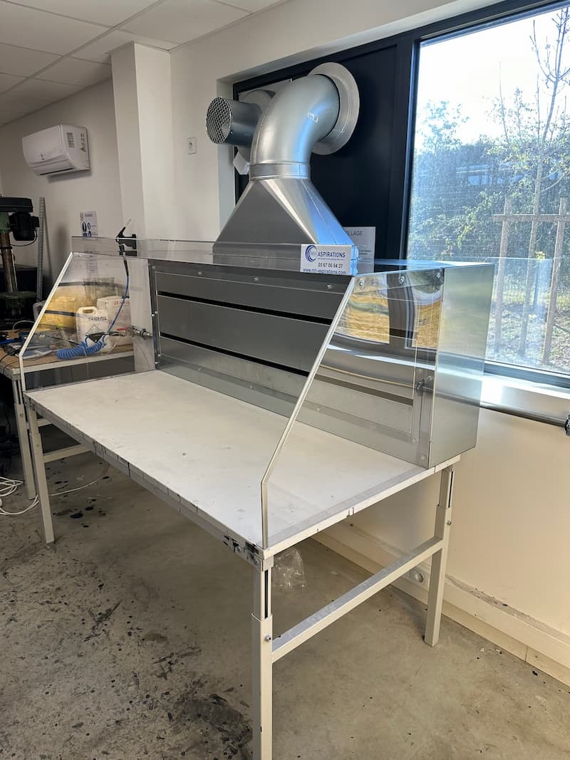 Un poste de travail ergonomique équipé d'un système d'extraction des poussières comprenant une table blanche, une hotte d'aspiration métallique et [...]