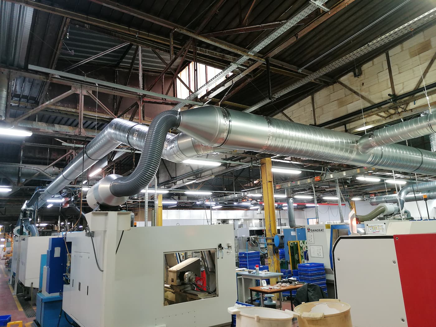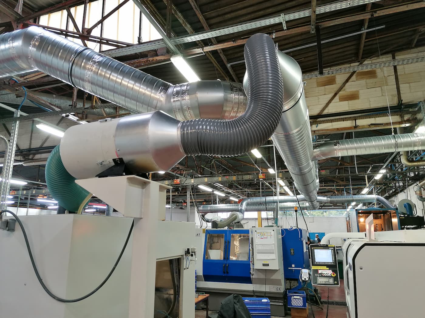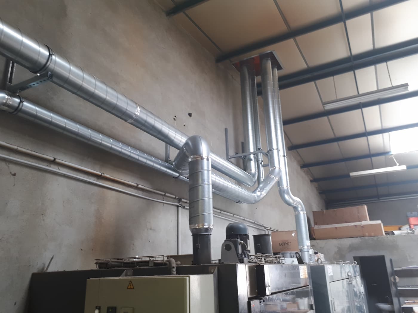 Réseau gaines galvanisées spiralée pour extraction fumée sur étuves. Rejet en toiture au travers d’une souche.