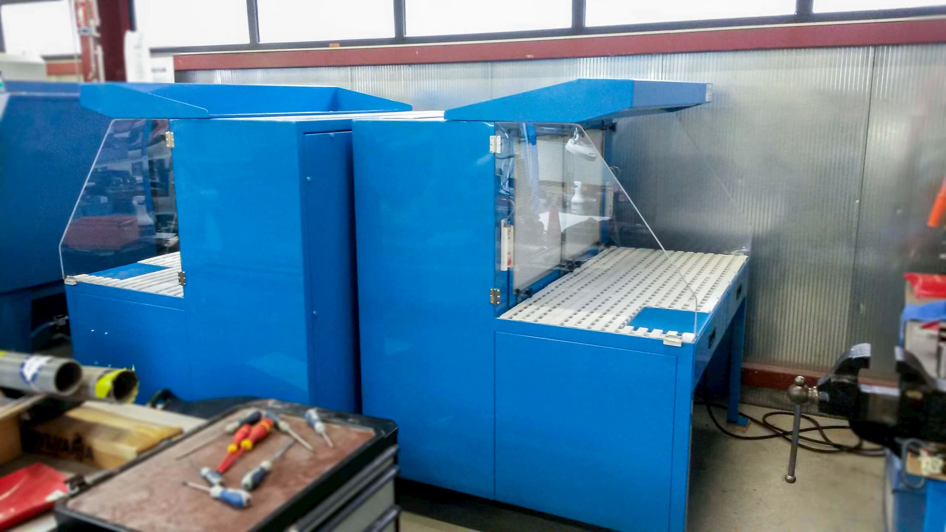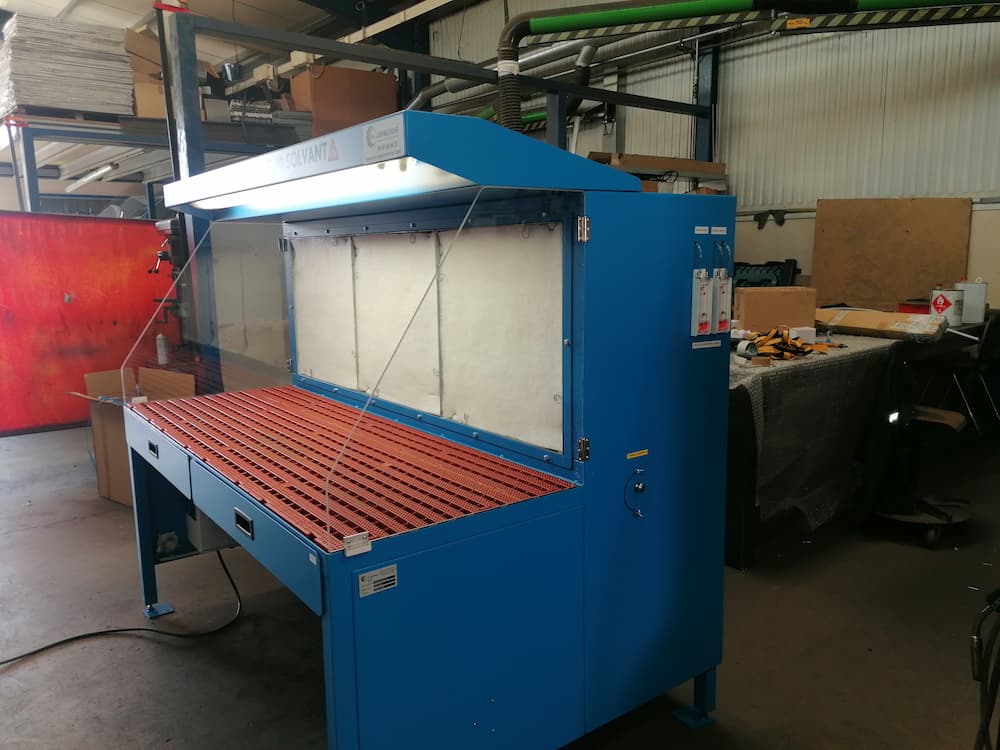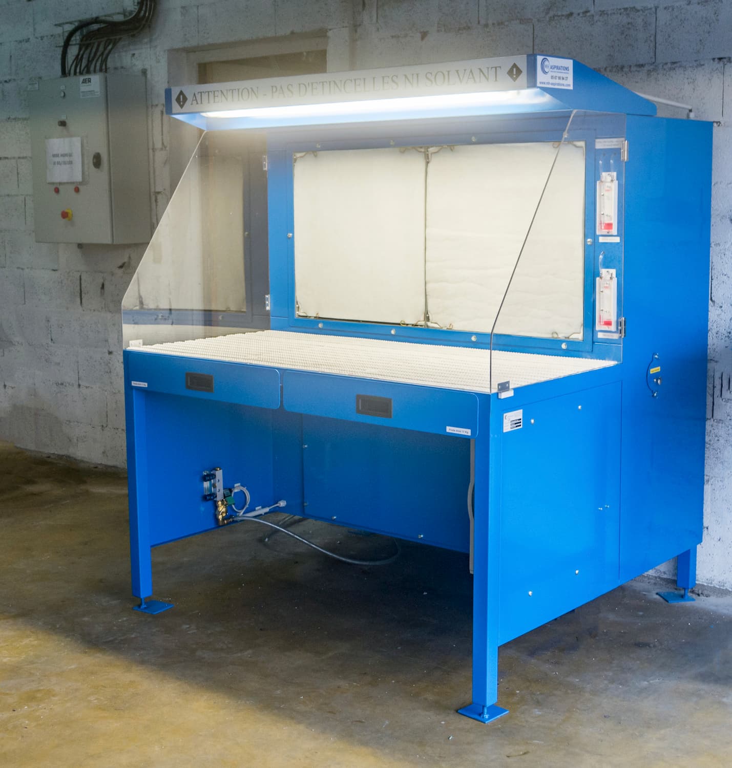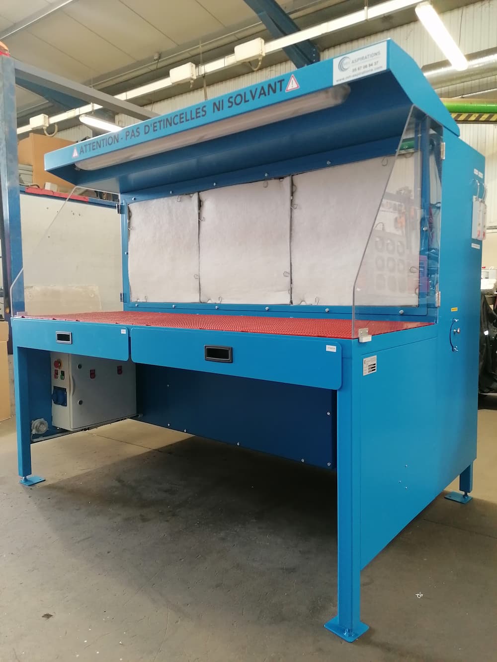 Table aspirante autonome 1.5 mètres bleu pour ponçage, ébavurage de pièces aéronautique en aluminium. Aspiration de poussière d’aluminium avec surface filtrante haute efficacité.