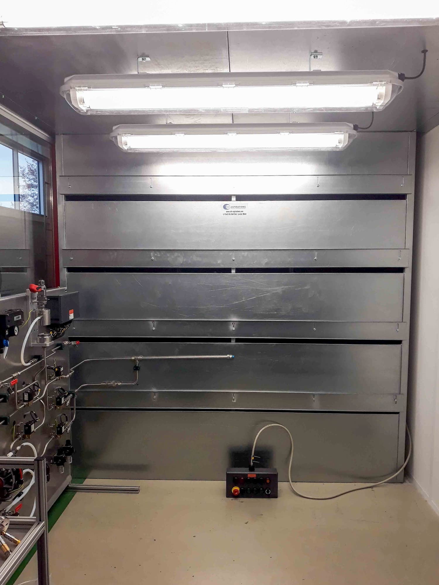 Cabine d’aspiration en acier galvanisé pour opération de ponçage de pièce d’aluminium aéronautique. Aspiration de poussière d’aluminium et filtration. Eclairage [...]